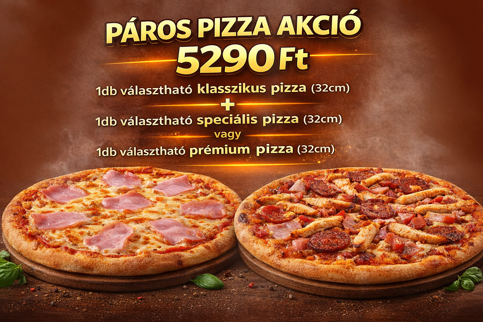 Bármelyik klasszikus 26os pizza plusz hasáb vagy steak burgonya, választható...