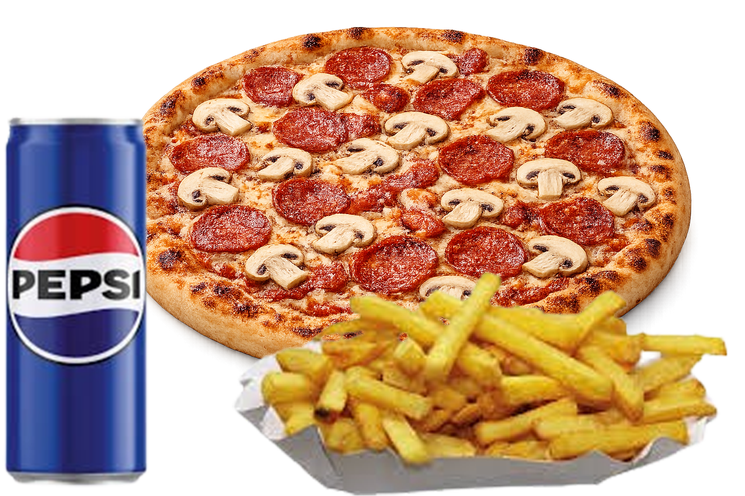 (Bármelyik klasszikus 26os pizza plusz hasáb vagy steak burgonya, választható 0, 33 dobozos pepsi üdítő)