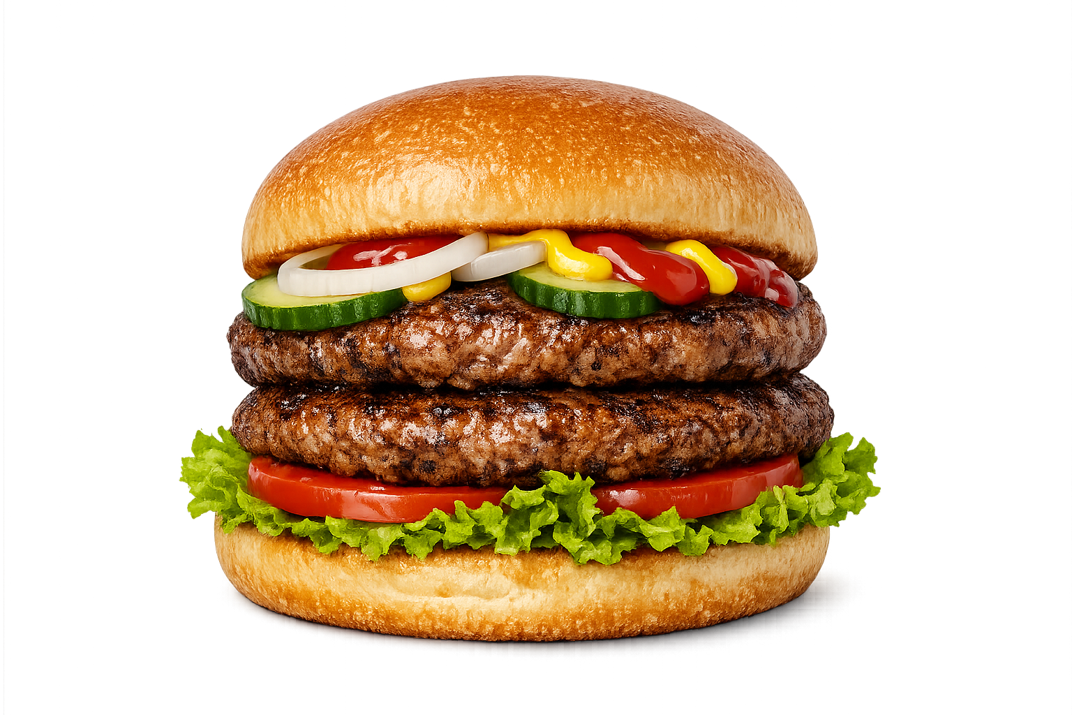 (2 db hambihus, saláta, pari, ubi, hagyma, mustar, ketchup)