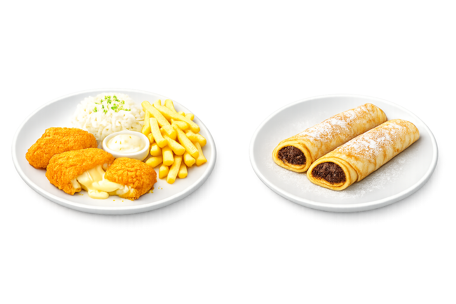Rántott csirkemell + vegyes köret + 2 db kakaós palacsinta